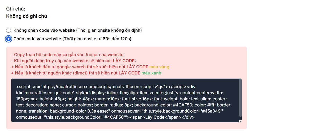 Chèn code vào website sẽ khiến cho user làm nhiệm vụ trên MuaTrafficSEO có thể vào website của bạn với thời gian lâu hơn, ổn định hơn.