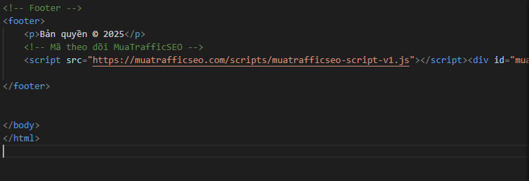 Nếu website của bạn dùng framework hoặc template layout, hãy chèn đoạn mã này vào layout chung (thường là file footer.php, layout.blade.php, footer.html...), ngay trước </body>.